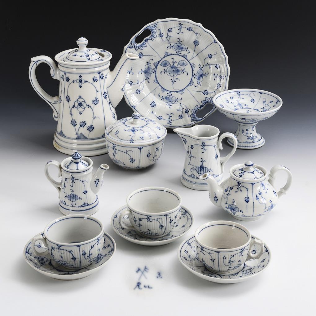 Überwiegend mit dem Reliefdekor "Gebrochener Stab". Kaffeekanne (H 24 cm), Wasserkännchen (H 11,5 cm), Milchkännchen, Teekanne (H 10,5 cm), 3 Tassen (H 5,5 cm) mit 3 Untertassen (Ø 14,5 cm), Kredenzteller (Ø 25 cm), Tafelaufsatz (H 10 cm) und Zuckerdose (H 11,5 cm). Haarriss in 1 Untertasse.