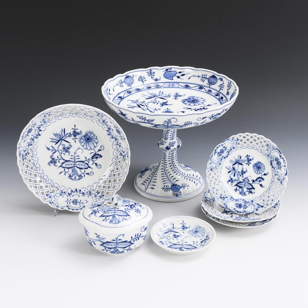 1x Teichert: Tafelaufsatz (H 21,5 cm). / 6x Meissen, verschiedene Marken, 1. Wahl und 2 Schleifstriche: vierpassige Zuckerdose (H 10 cm), 3 Durchbruchteller (Ø 15 cm), 1 Durchbruchschale (Ø 21 cm) und 1 Tellerchen (Ø 10,5 cm). Bestoßung an 1 Tellerrand, Zuckerdosenknauf bestoßen.