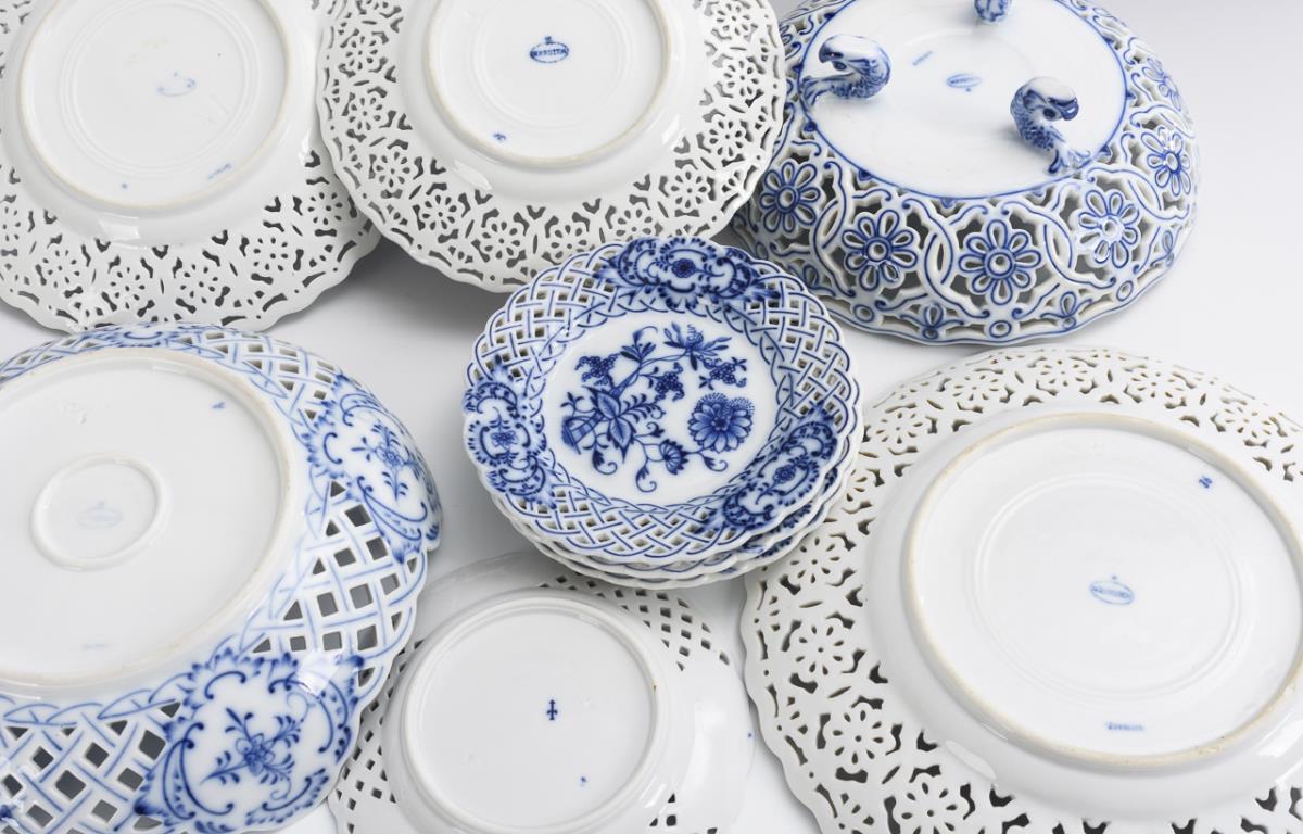 3 Teller (Ø 20, 22 und 26 cm) und 1 runde Fußschale (Ø 22 cm) mit Blütendurchbruch, 5 Teller (Ø 15 cm) und 1 runde Schale (Ø 23,5 cm) mit Korbdurchbruch.