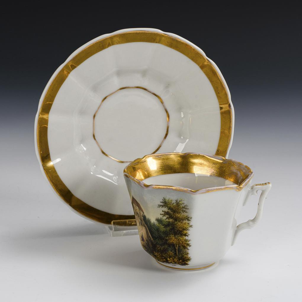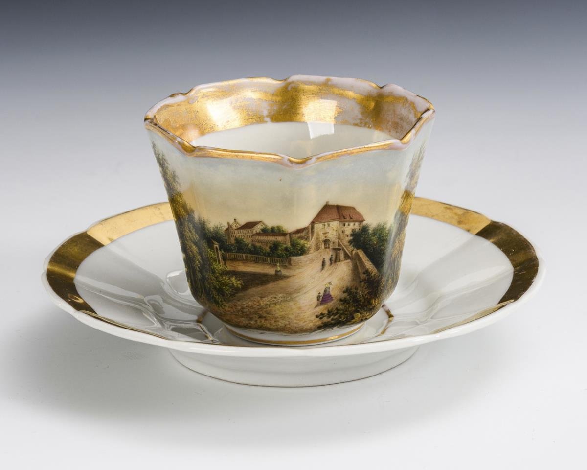 Polychrom bemalt, goldstaffiert. Tasse (H 6,5 cm), originale Untertasse (Ø 15 cm).