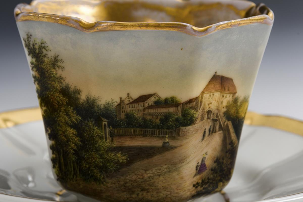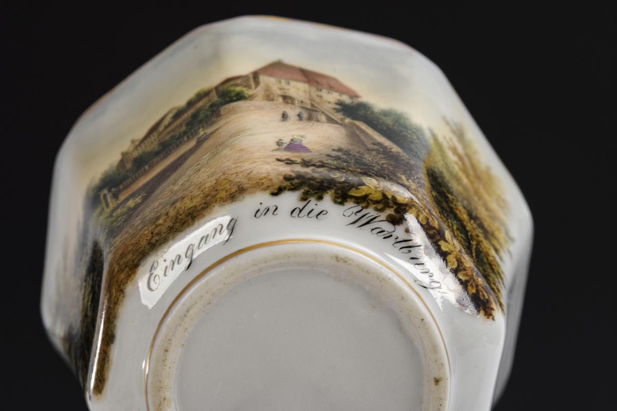 Polygonal-konische Tasse mit spitz geschweiftem Henkel. Schauseitig die bezeichnete Ansicht des Einganges der Wartburg bei Eisenach. Gold berieben.