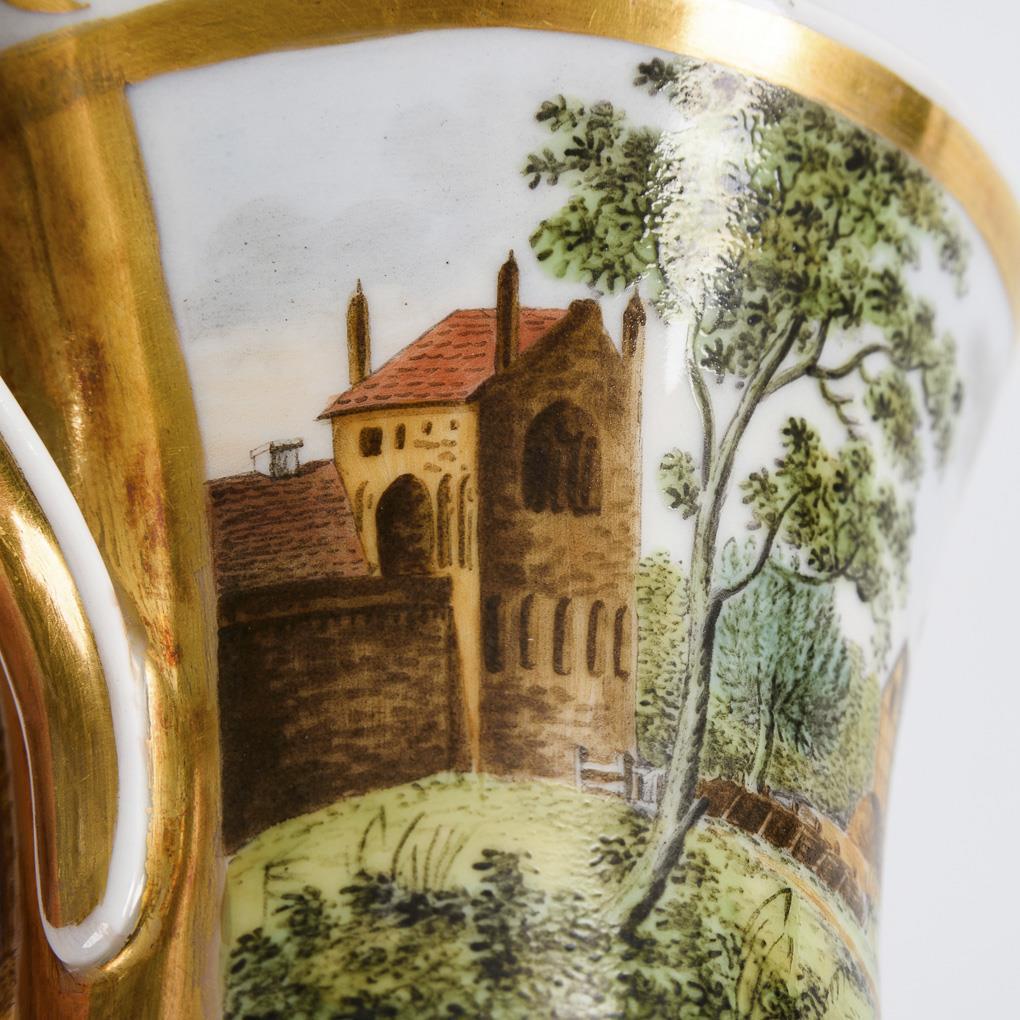 Kratertasse mit der umlaufenden Darstellung einer Landschaft mit dem Treptower Tor, Fachwerkhäusern und Fluss, unterseitig bezeichnet "Eine Partie vom Treptower Thor n. d. Bellevedere".