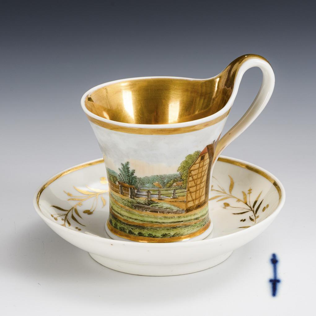 Polychrom bemalt, goldstaffiert. Tasse (H 8,5 cm), ergänzte Untertasse (Ø 12,5 cm).