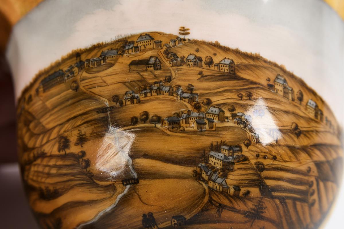 Gefußte Glockentasse mit mehrpassigem Rand und Stand. Schauseitig eine goldgerahmte Rechteckkartusche mit der sepiagemalten, landkartenartigen Darstellung einer durch zahlreiche Felder und Wiesen gegliederten Landschaft mit Häusern und Personenstaffage. Fuß restauriert sowie restaurierter Randchip.