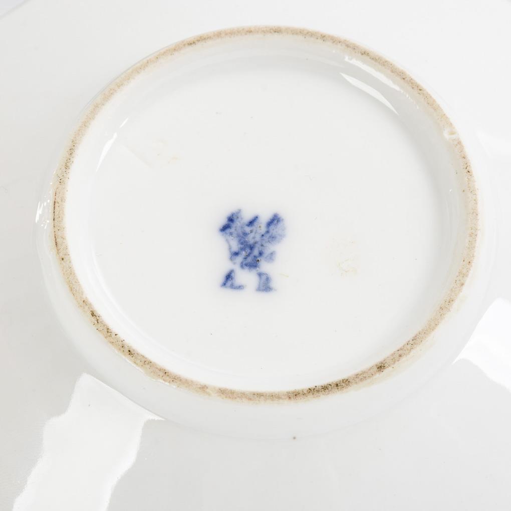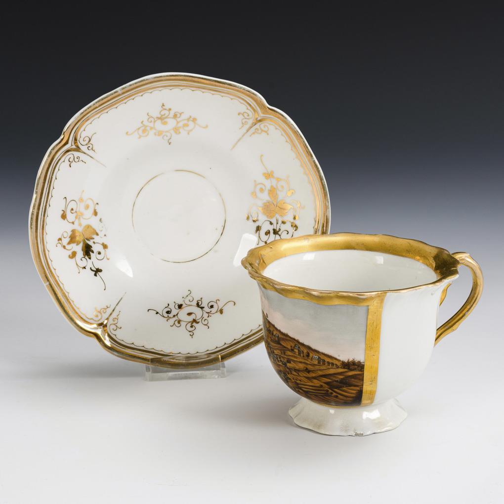 Polychrom bemalt, goldstaffiert. Tasse (H 7,5 cm), ergänzte Untertasse (Ø 14,5 cm).