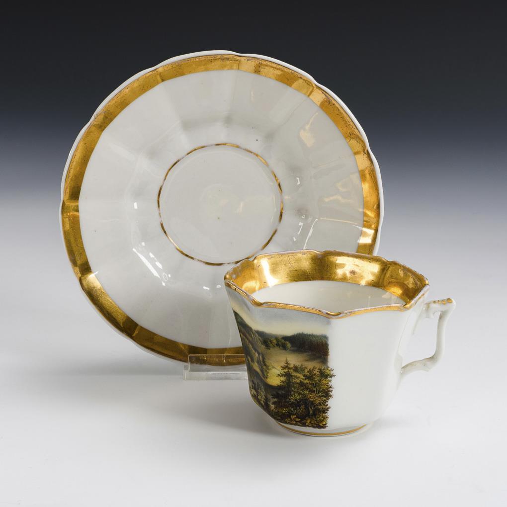Polychrom bemalt, goldstaffiert. Tasse (H 6,5 cm), originale Untertasse (Ø 15 cm).