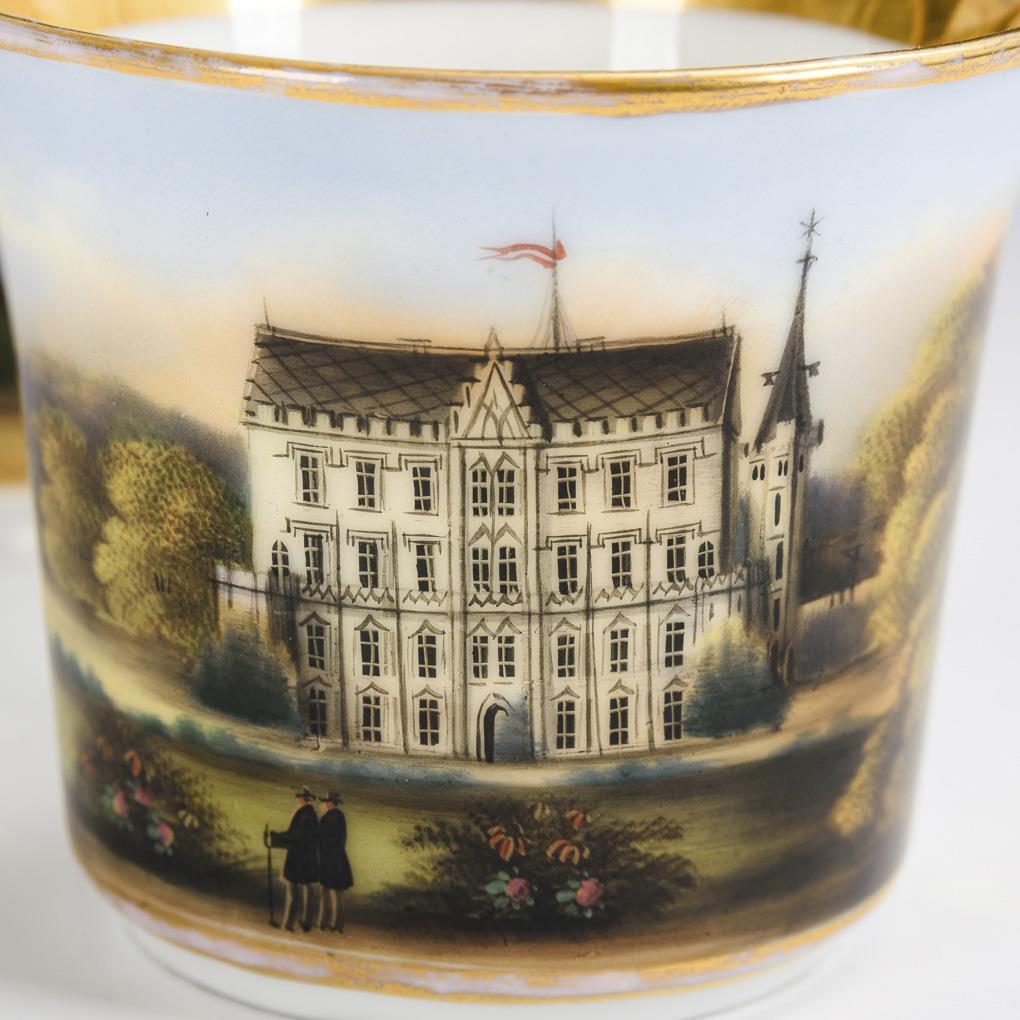 Kratertasse mit Ohrenhenkel. Schauseitig eine goldgerahmte Kartusche mit der Ansicht des Schlosses Reinhardsbrunn bei Friedrichroda in Thüringen. Minimaler Goldabrieb.