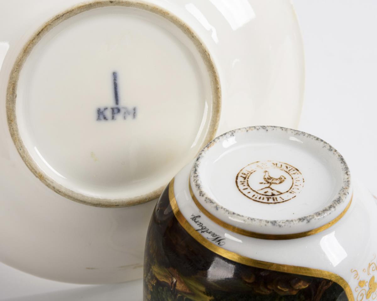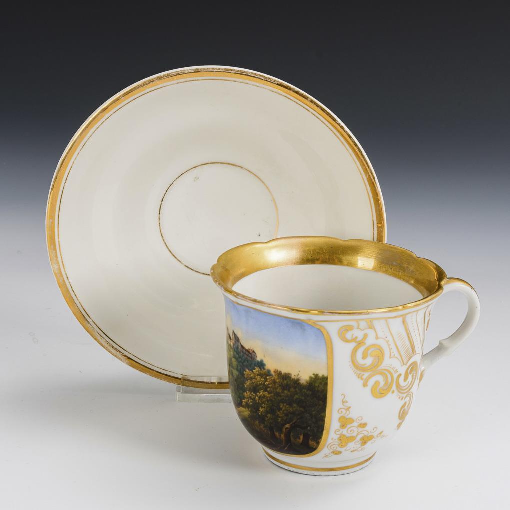 Polychrom bemalt, goldstaffiert. Tasse (H 8,5 cm), ergänzte Untertasse (Ø 15,5 cm).