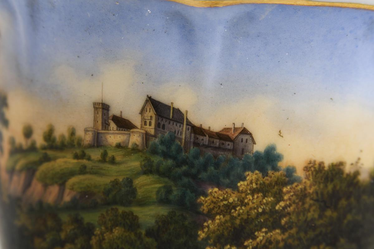 Glockentasse mit Ohrenhenkel. Schauseitig eine goldgerahmte Kartusche mit der Ansicht der Wartburg bei Eisenach, verso ornamentale Goldmalerei. Restaurierter Henkel und Chip am Mündungsrand.