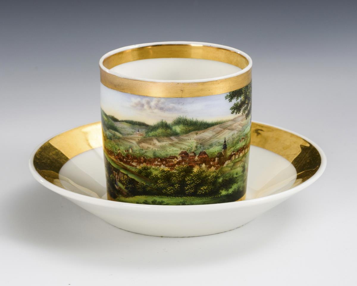 Zylindertasse mit Ohrenhenkel. Schauseitig eine große, goldgerahmte Rechteckkartusche mit der bezeichneten Ansicht des Ortes Benshausen in Thüringen, heute ein Stadtteil von Zella-Mehlis. 1 Randrestaurierung an der Tasse.