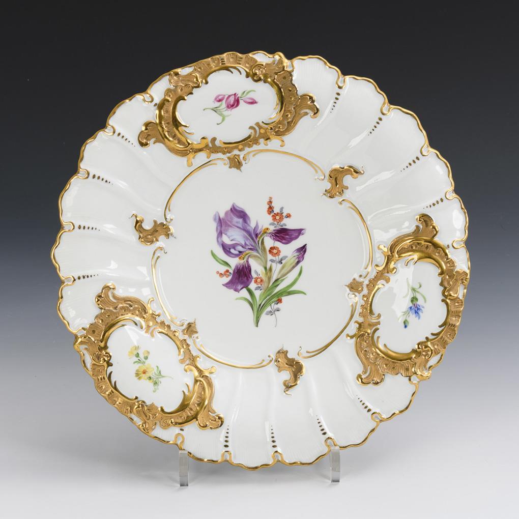 Schale mit muschelreliefierter Fahne und drei Rocailleschildern. Im Spiegel Blumenmalerei mit Iris.