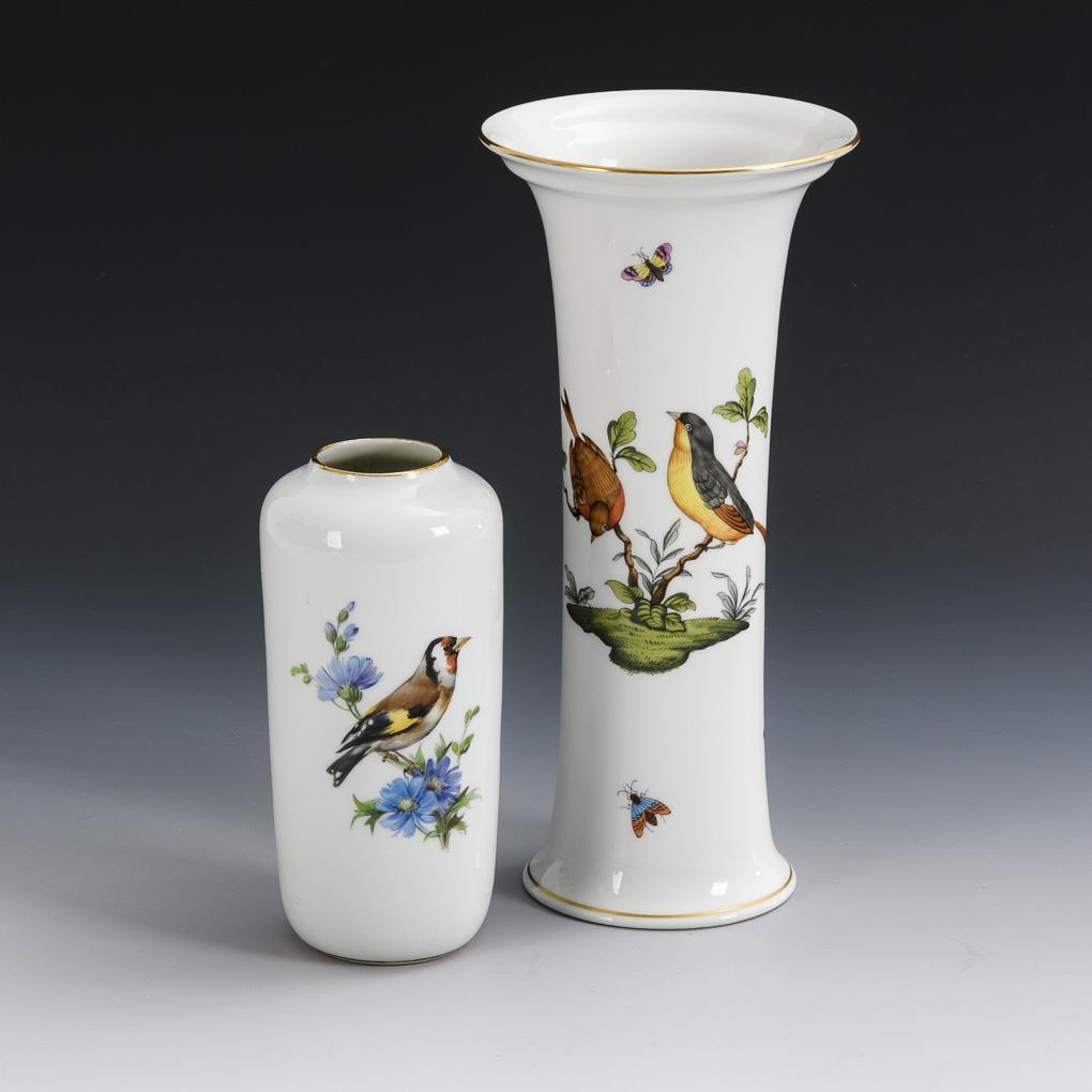 1x MEISSEN, Schwertermarke, 2. H. 20. Jh., 2 Schleifstriche: Balustervasemit der schauseitigen Darstellung eines Stieglitzes. / 1x HEREND, 2. H. 20. Jh.: Flötenvase mit Rothschilddekor.