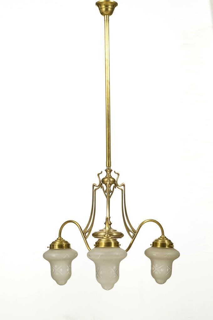 3-flammige Hängelampe an Mittelschaft mit Glockenbaldachin und 3 geschweiften Armen mit stiltypischem Floraldekor und Glockenschirmen. Metall mit minimalen Korrosionsspuren, Glasränder mit kleinen Chips.