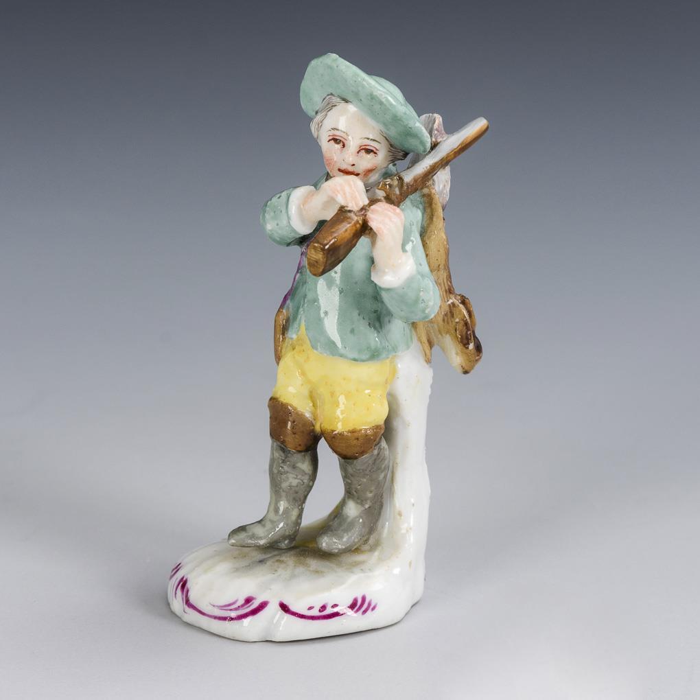 Jäger mit einem am Gewehr hängenden, erlegten Hasen und Vogel. Gewehr und Vogel restauriert.