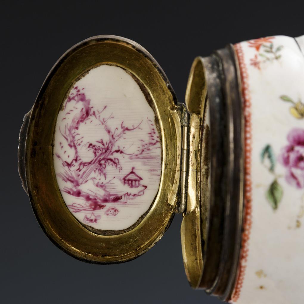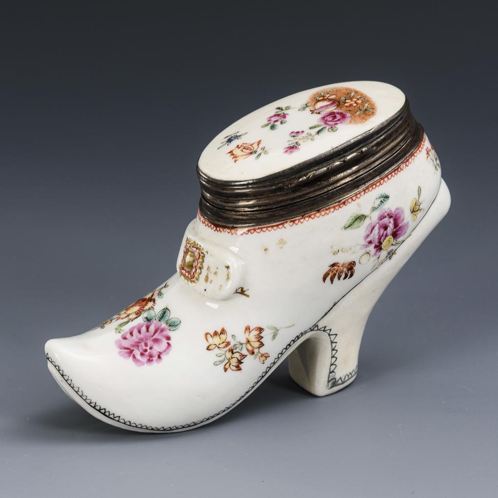 Als barocker Frauenschuh gestaltete Tabatiere mit silbermontiertem Scharnierdeckel (ungepunzt, Silber geprüft) und Blumenmalerei. Absatz restauriert.