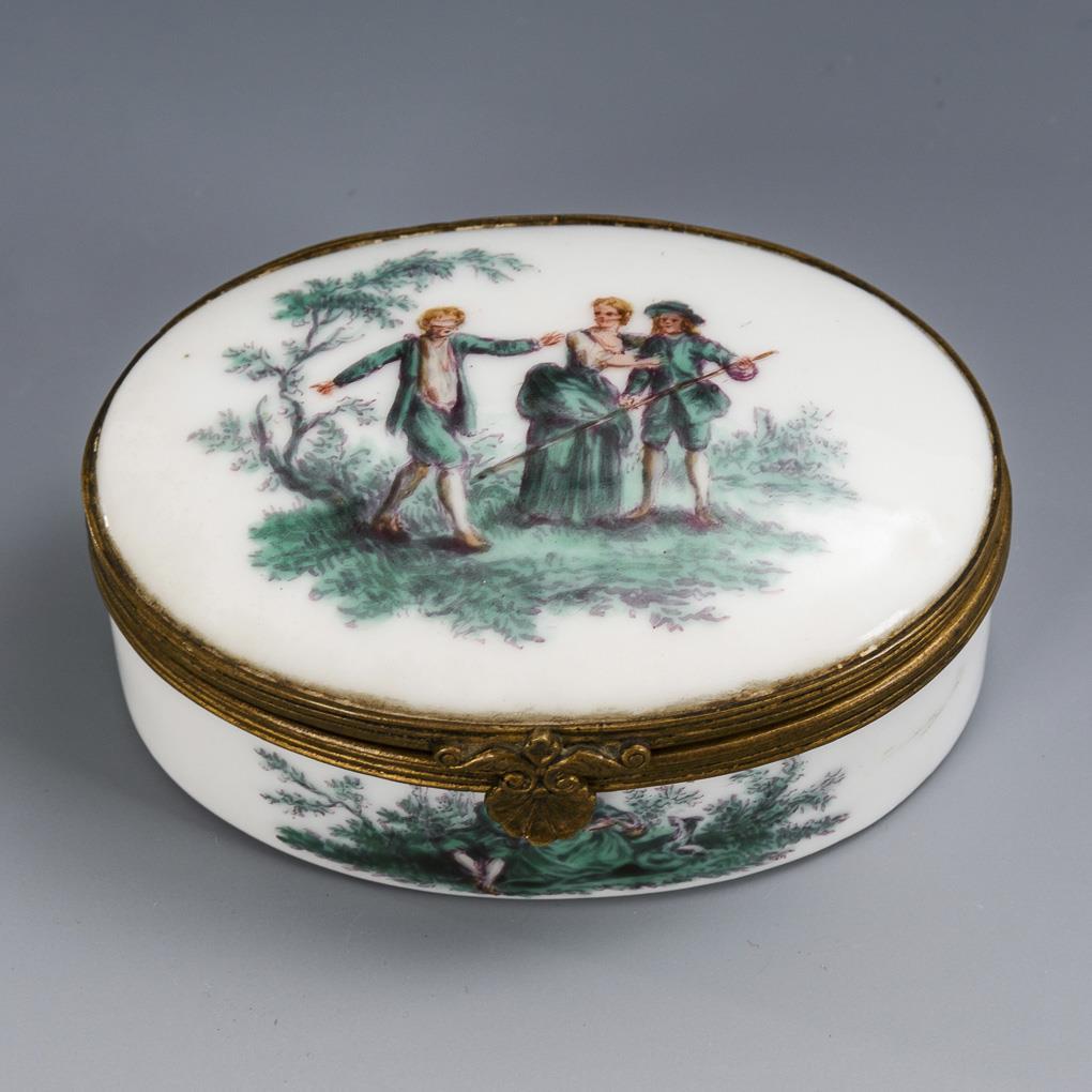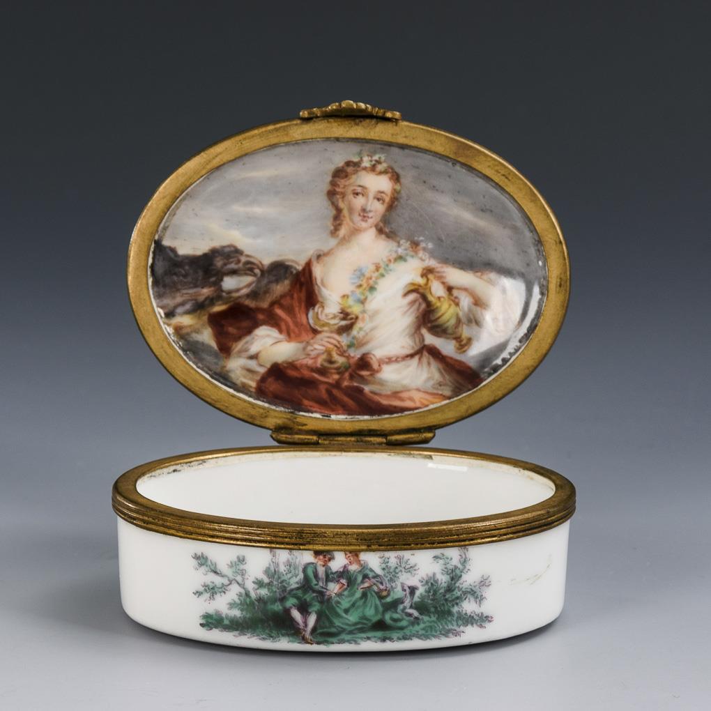 Ovale Dose mit metallmontiertem Scharnierdeckel. Allseitig kupfergrüne galante Szenen, auf der Deckelinnenseite das Bildnis der Louise-Henriette de Bourbon als Hebe, nach einem Gemälde von Jean-Mac Nattier (1685-1766). Standfläche minimal berieben.