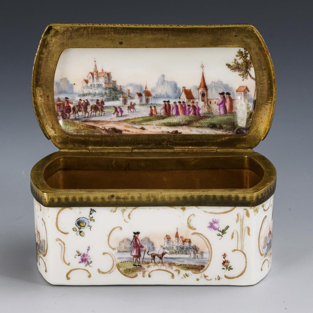 Dose in Form einer Truhe mit Rocaillerelief. Allseitig in Rocaillekartuschen fein gemalte Landschaften mit verschiedenen Figuren, im Deckel die figurenreiche Darstellung einer sich der Burg nähernden herrschaftlichen Kutsche mit zahlreichem, der Herrschaft huldigendem Volk am Wegrand, Korpus innen vergoldet.