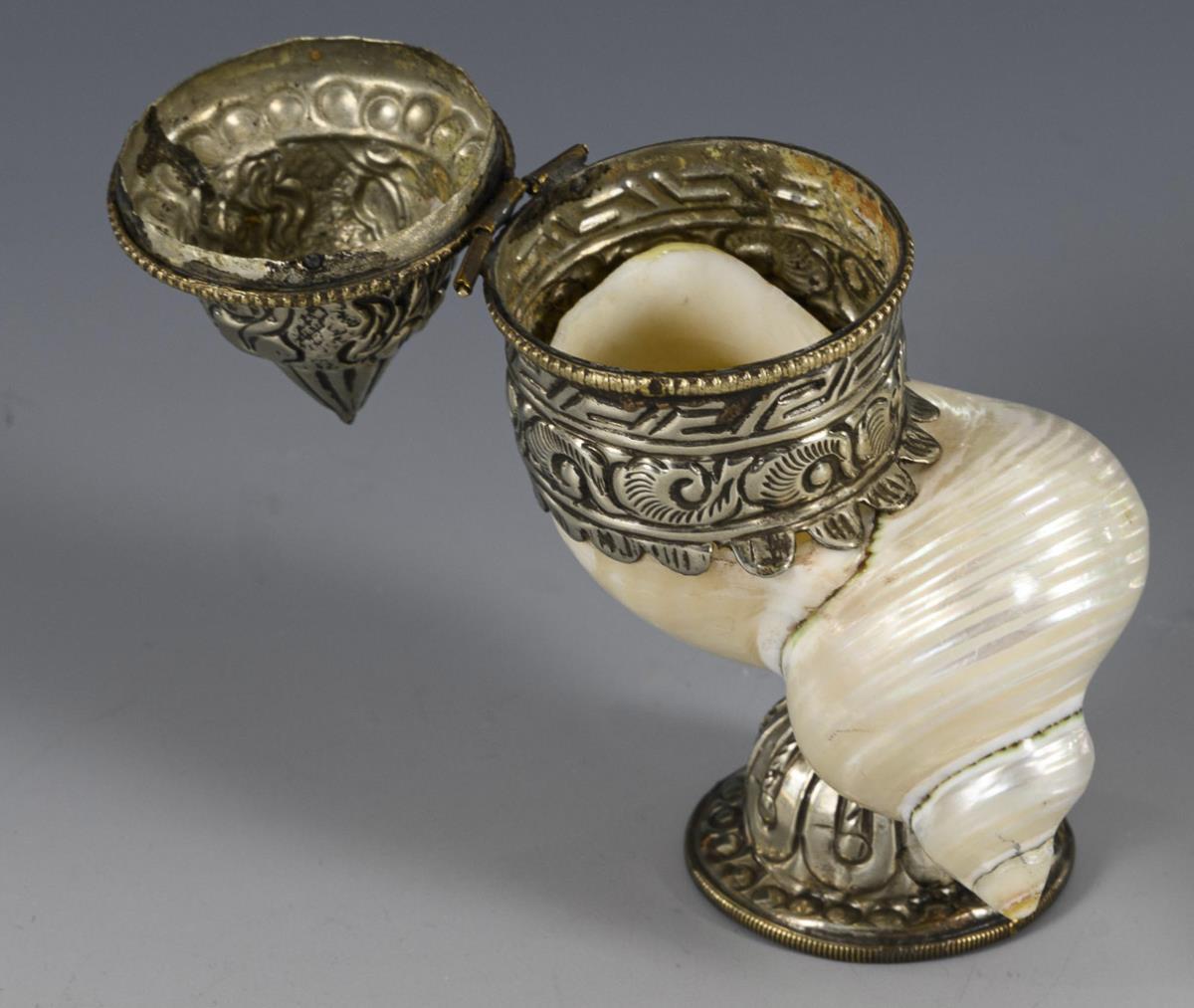 Perlmutt-Schnecke auf Rundfuß, mit reliefiertem Silberdeckelchen. Am Fuß alt repariert.