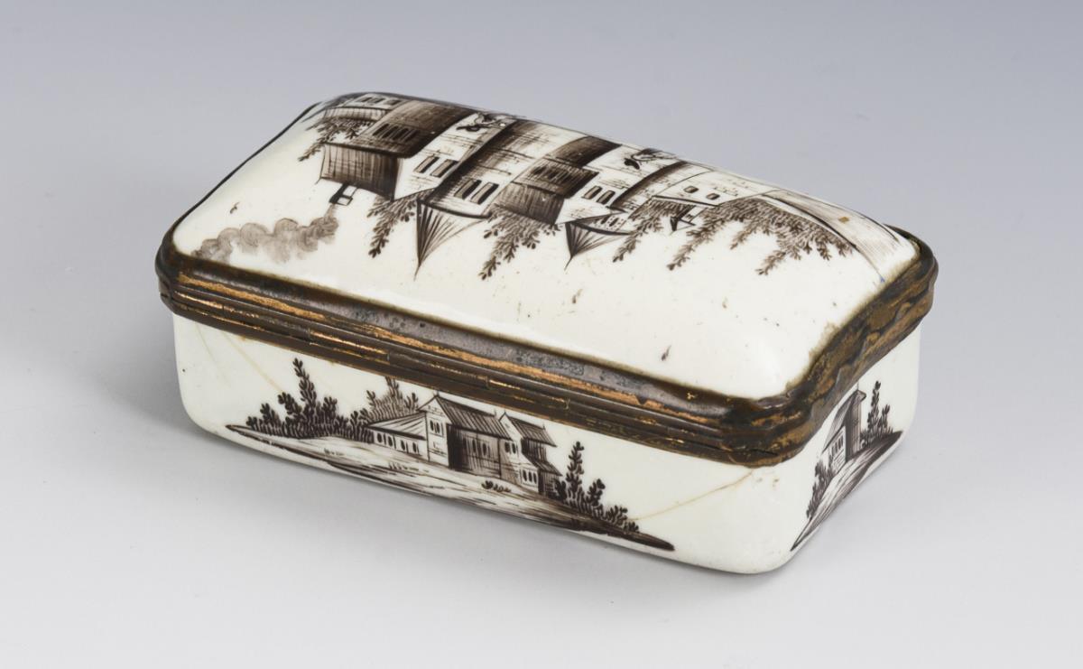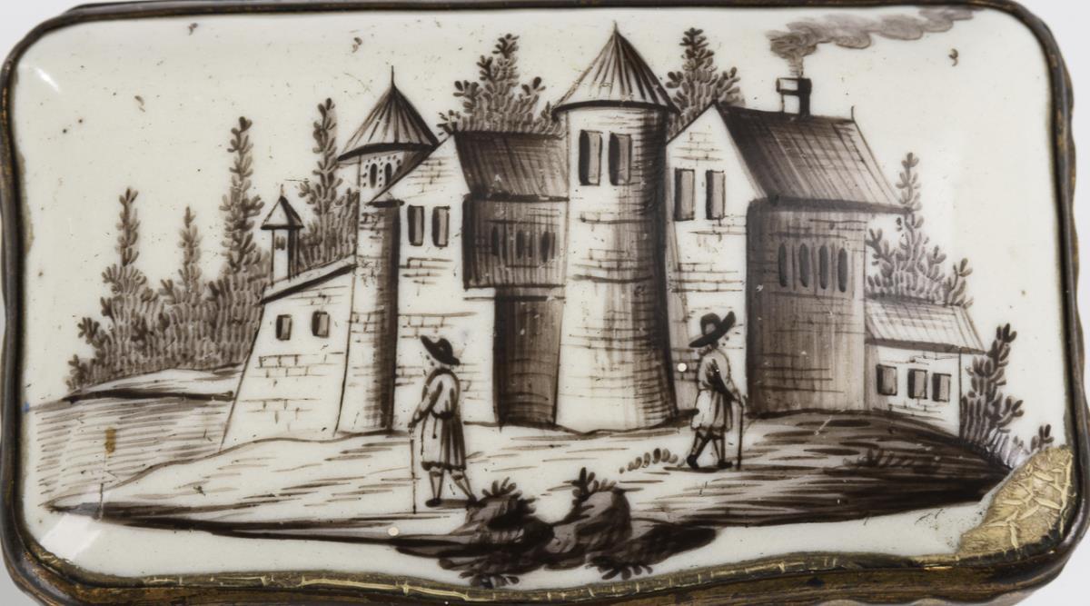 Quaderdose mit leicht geschwungenen Seiten und stark gewölbtem Scharnierdeckel. Allseits und im Deckel Architekturdarstellungen, teils mit Staffage. Berieben, 1 Abplatzer alt verfüllt, leicht krakeliert.