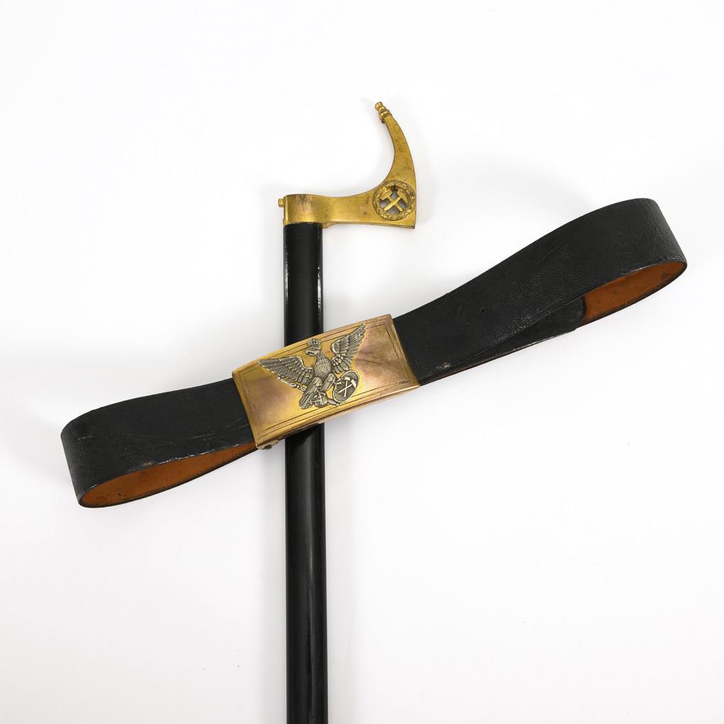 Auf dem Koppelschloss applizierter Hoheitsadler mit Reichsinsignien und Bergmannsymbol. Im Häckel à jour eingearbeitetes Bergmannsymbol im Eichenkranz. Vergoldung berieben, einige leichte Alters-/Gebrauchsspuren.