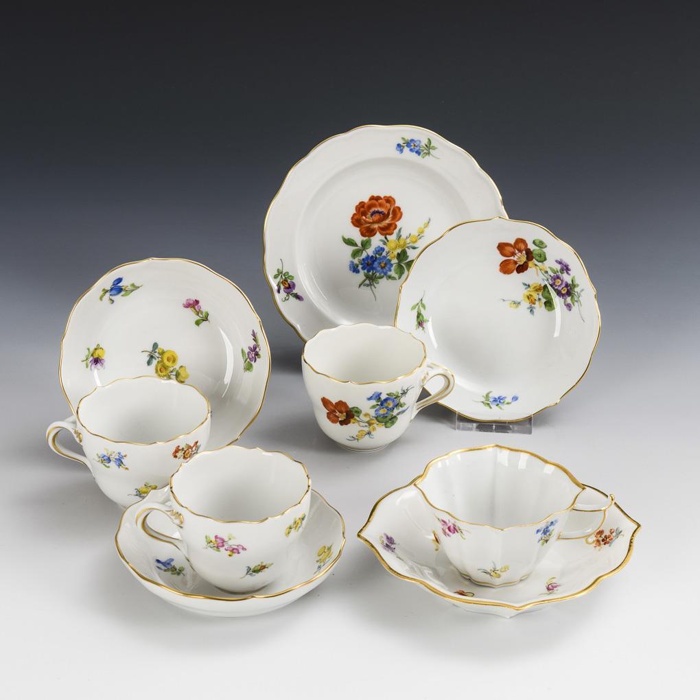 Polychrom bemalt, goldstaffiert. 4 Mokkatassen (H 4,5-5 cm), 3 Untertassen und 1 Teller (Ø 11-14 cm).