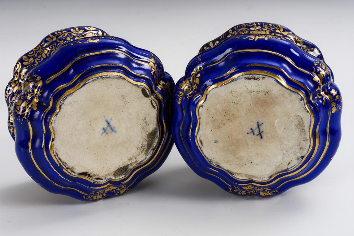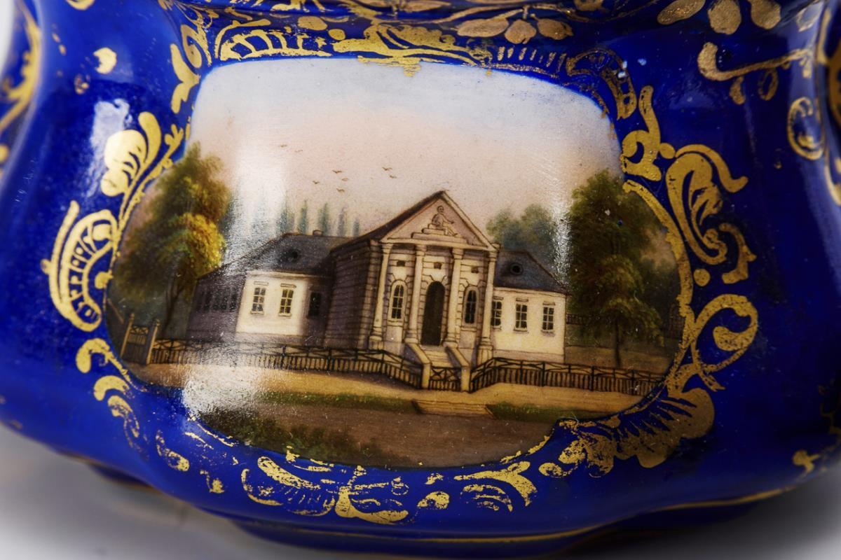Mehrpassige, gedrückte Gefässe mit blauem, reich goldbemaltem Fond. Auf der Wandung jeweils drei Vierpasskartuschen mit Ansichten von Altenburg (u.a. Freimaurerloge, Schützenhaus, Casino, das reiche Hospital [= Hospital zum Heiligen Geist], die roten Spitzen). Tintenfass ohne Deckel, beide restauriert.