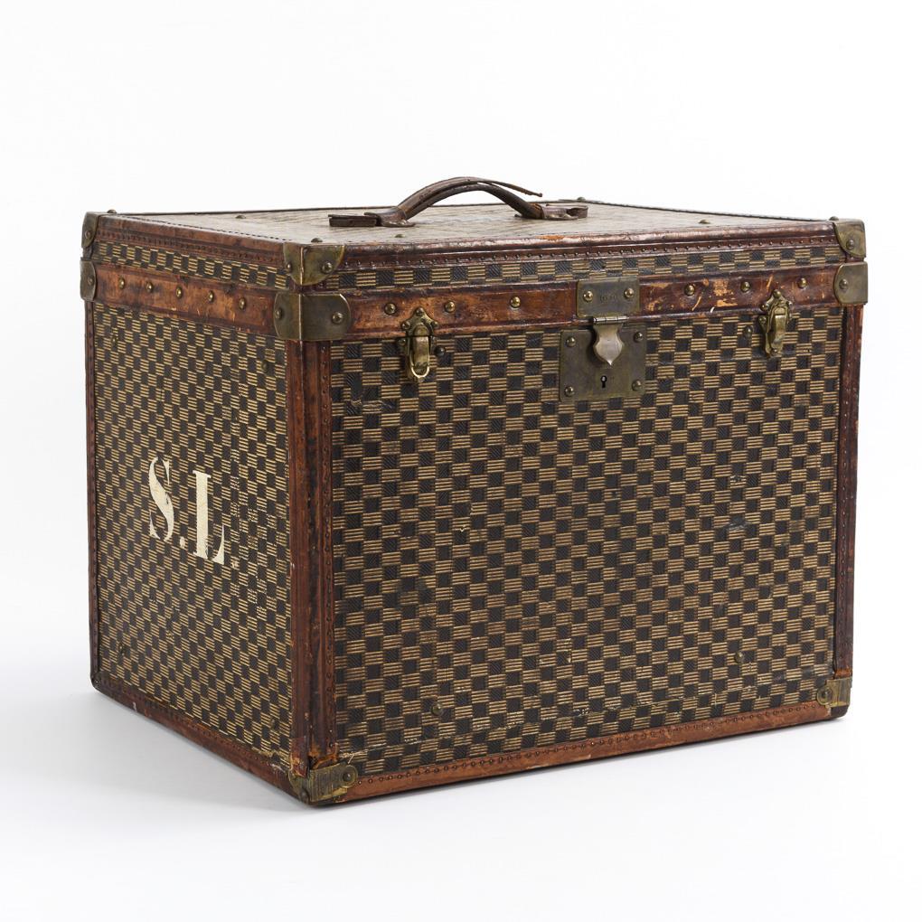 Hoher Koffer mit Tragegriff, allseits mit Goyardine-Leinwand versehen sowie lederverstärkten Kanten, Messing-Cloutage und -Beschlägen. Auf beiden Seiten weißes Besitzermonogramm "S.L.". Bei geöffnetem Scharnierdeckel lässt sich die Frontseite aufklappen. Innen vermutlich Schuh-Halterungen. Alters-/Gebrauchsspuren, Ledergriff teils gerissen.