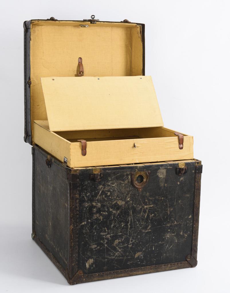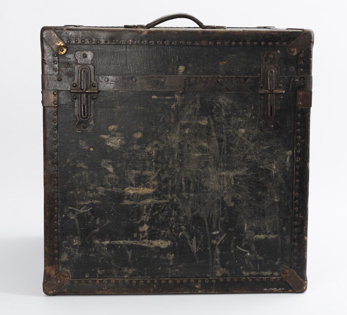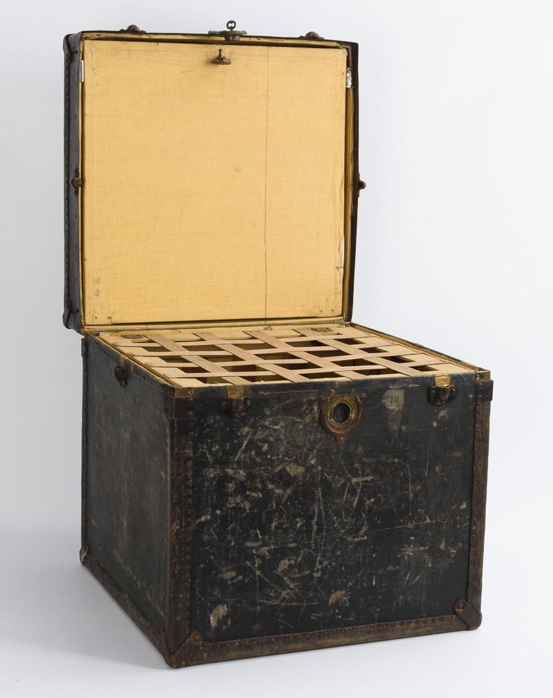 Holz mit lackierter Leinenbespannung, Eisenbeschläge- und Schloss, Kantenverstärkungen aus Leder, Ledertragegriff. 57 x 57 x 57 cm. 16,5 kg.