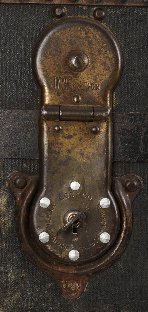 Auf dem Deckel Messing-Firmenplakette, Schloss "H. & A. Lock Co. Trunk Company" gemarkt mit Patentdatum "1904". Nach 1904.