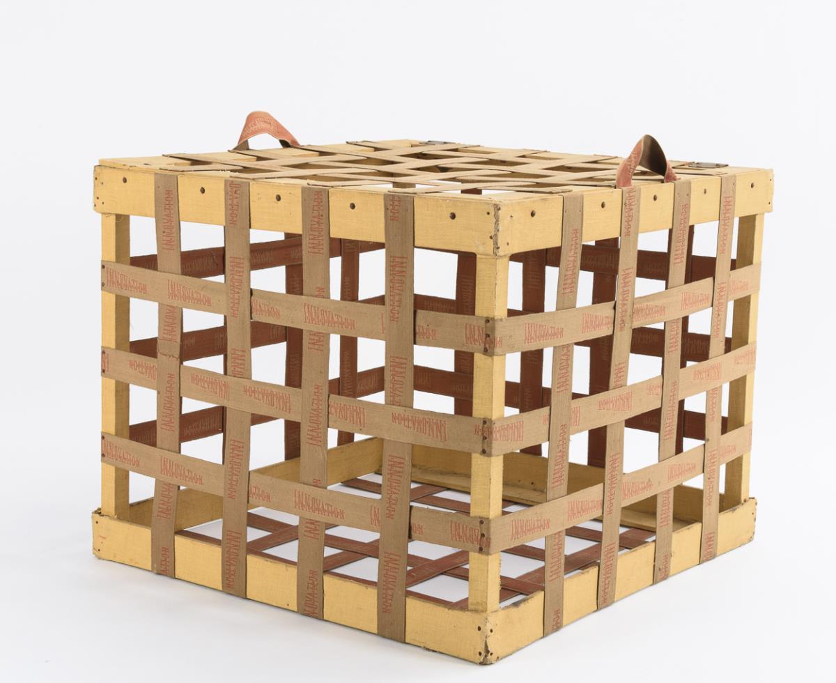 Würfelförmiger Koffer mit Scharnierdeckel. Innen herausnehmbare Gitterbox mit Gurtbespannung (Auf den Gurten "Innovation" gestickt), im Deckel Dokumentenfach. Alters-/Gebrauchsspuren.