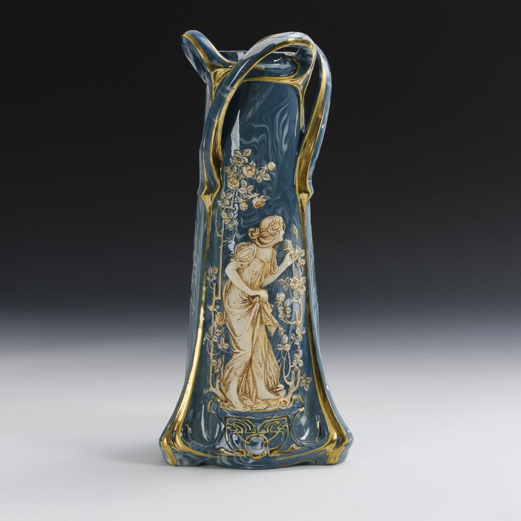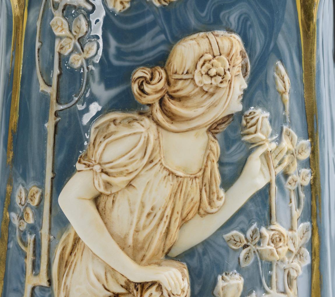 Dreiseitig-konische Vase mit drei geschwungenen Henkeln und floral-ornamentalem Relief. Schauseitig das Biskuitrelief einer Dame im Rosengarten. Partiell Gold etwas berieben.