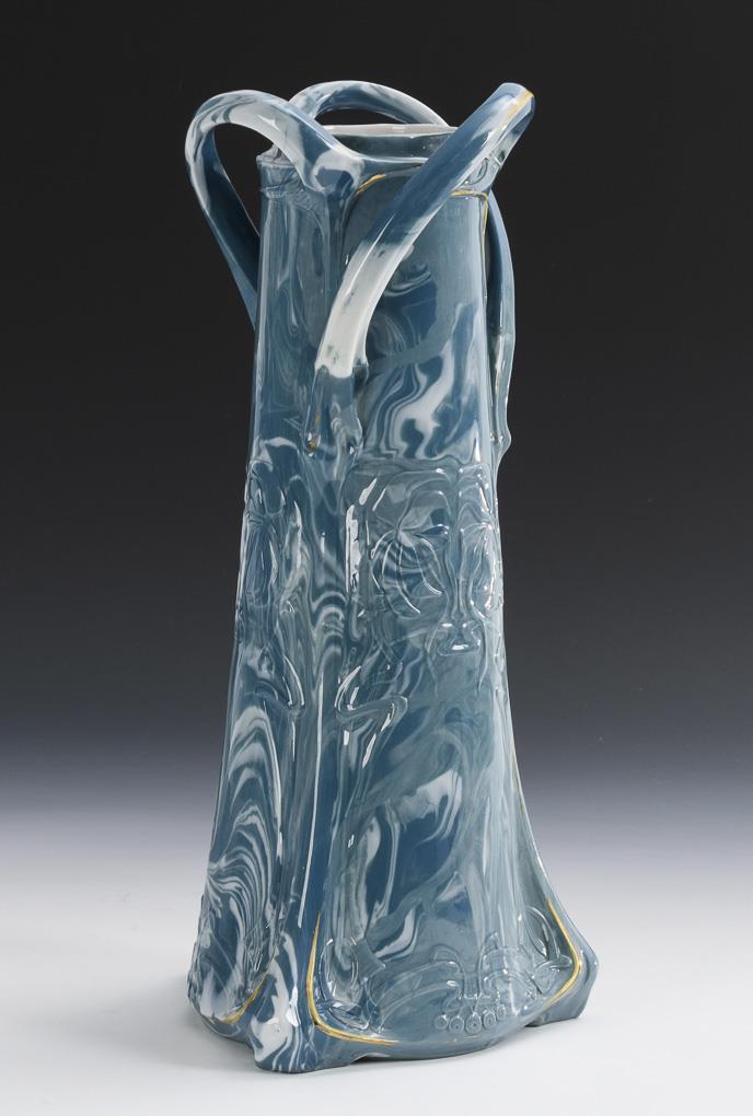 Weißes und in der Masse gefärbtes, blau-weiß marmoriertes Porzellan, Figurrelief elfenbeinfarben mit bräunlicher Patinierung. H 36 cm.