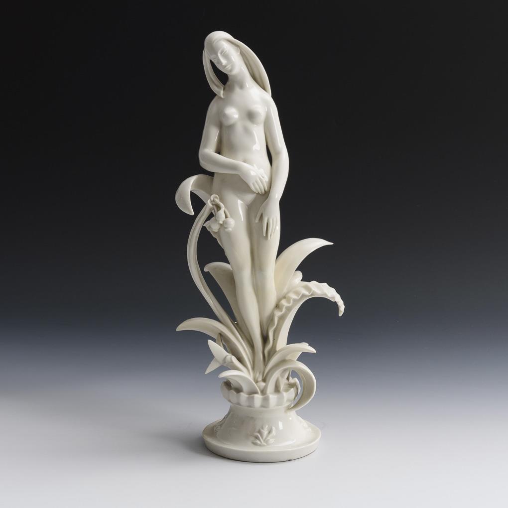Aus einer Pflanze hervorwachsender Frauenakt. Restaurierung am Sockel, 3 Blätter und Beine restauriert.