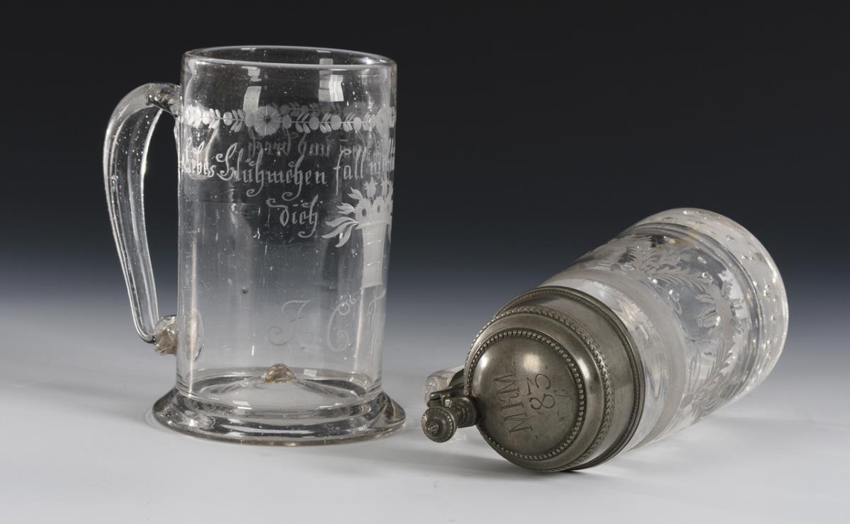 1x Walzenkrug mit Bandhenkel und Abriss: graviert mit einer Blumenbordüre, einem Blumenkorb sowie der Aufschrift "Liebes Blühmchen fall nicht ab, bis ich komm und brech dich ab / J. C. T. Schröder". / 1x konischer Krug mit Bandhenkel, eingestochenen Luftblasen im massiven Boden und Zinndeckel; Abriss: auf der Wandung gravierte Blumenfestons. 1x Spannungsriss am Abriss, Riss im Zinndeckel.