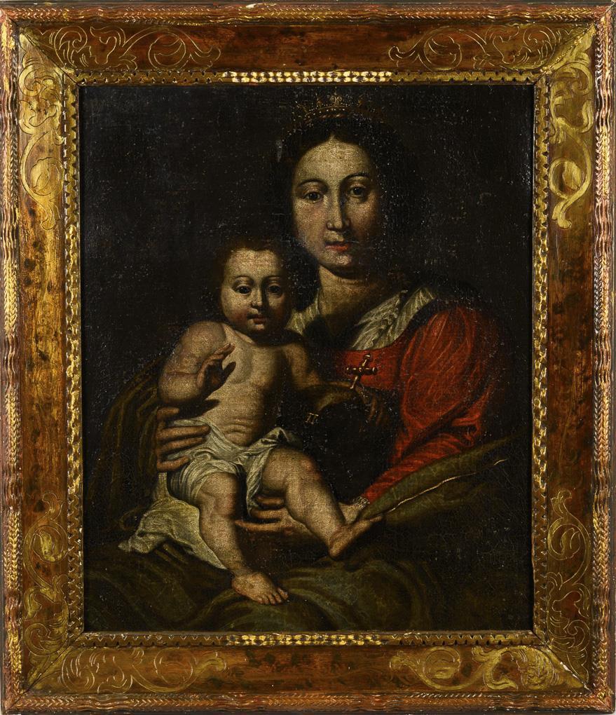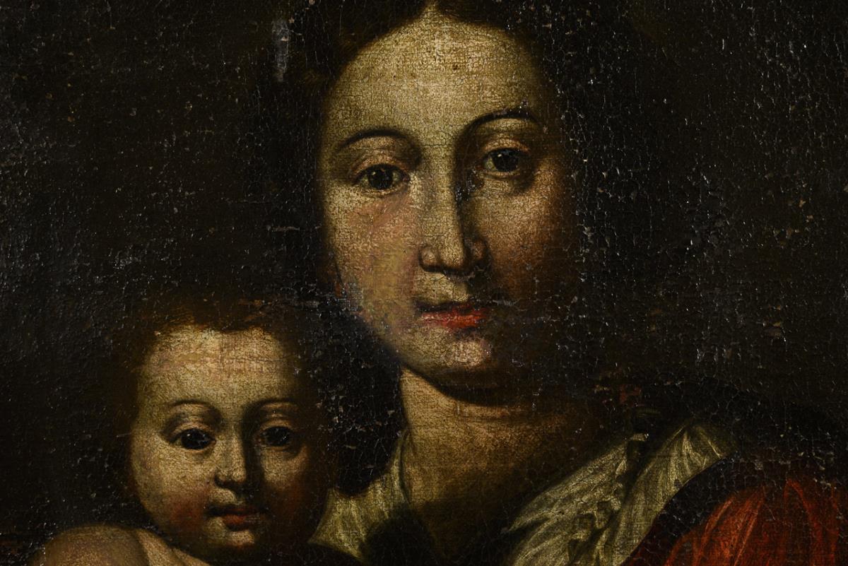 Maria mit dem Jesuskind vor dunklem Hintergrund. Restaurierungsbedürftig.