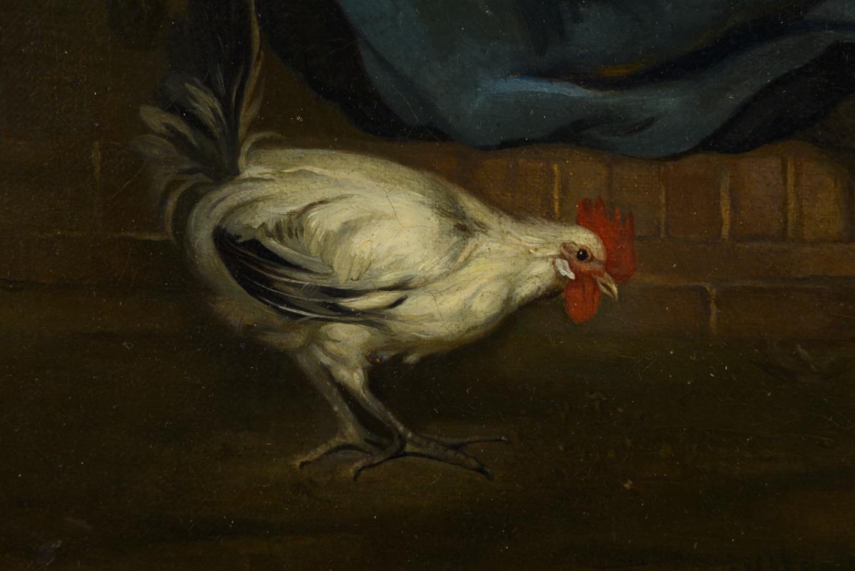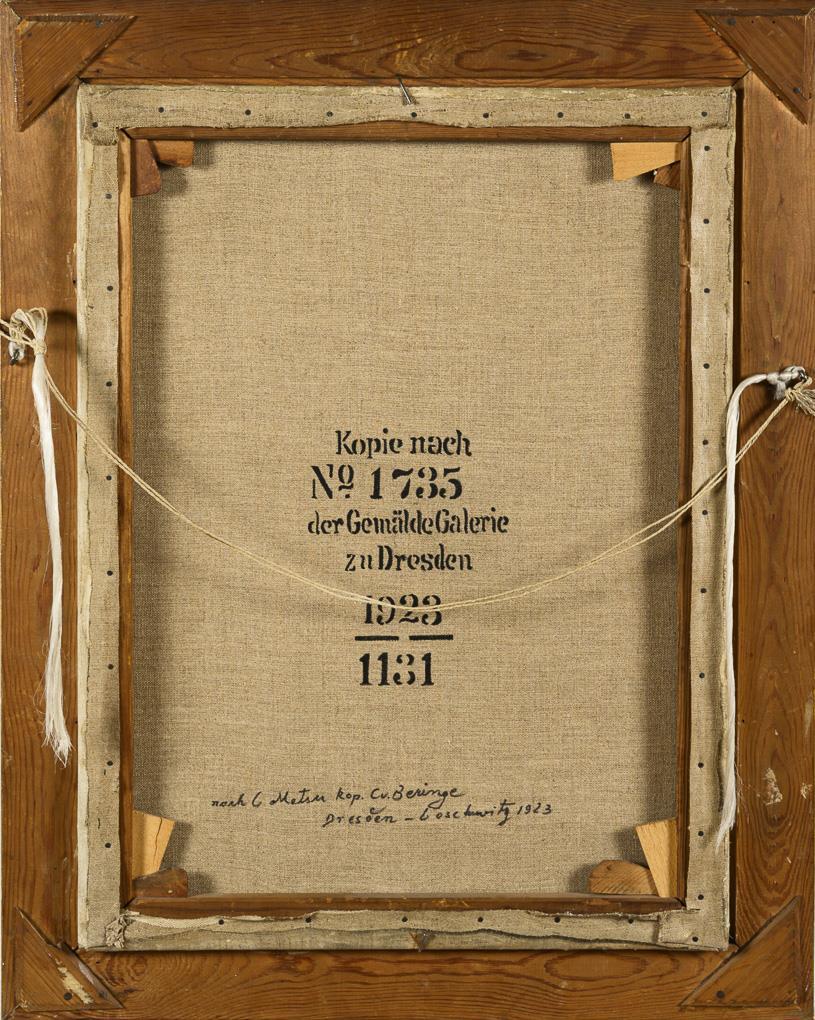 Sehr gute Kopie nach dem holländischen Original, welches heute in der Gemäldegalerie Alte Meister in Dresden zu sehen ist. Altersspuren.