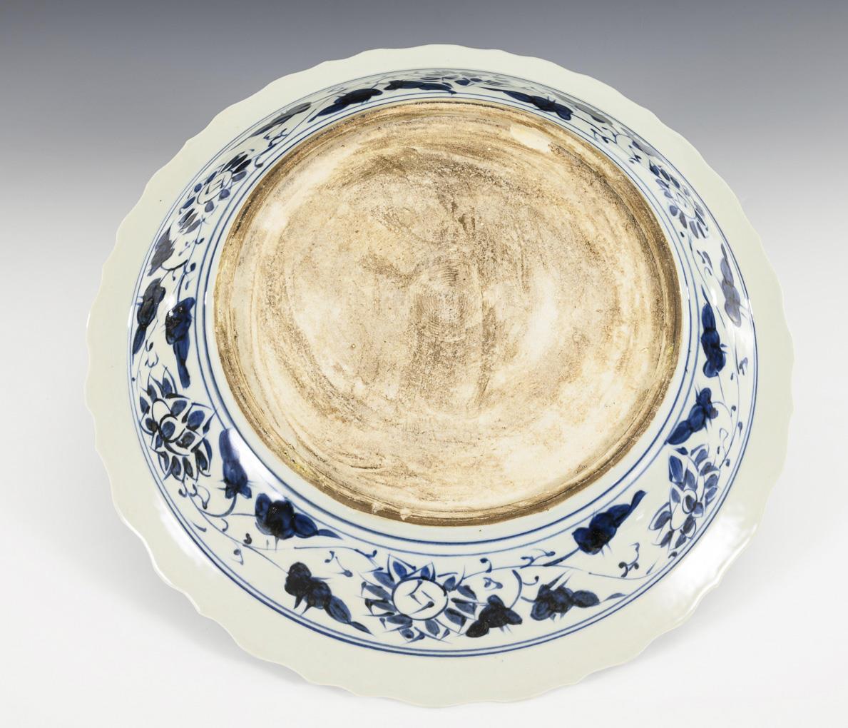 Dynamisch gemalte Reiterszene in Unterglasurblau auf tiefem Teller mit gewelltem Rand. Unterseite mit breiter, floraler Musterkante verziert. Kleine, produktionsbedingte Glasurfehler am äußersten Rand.