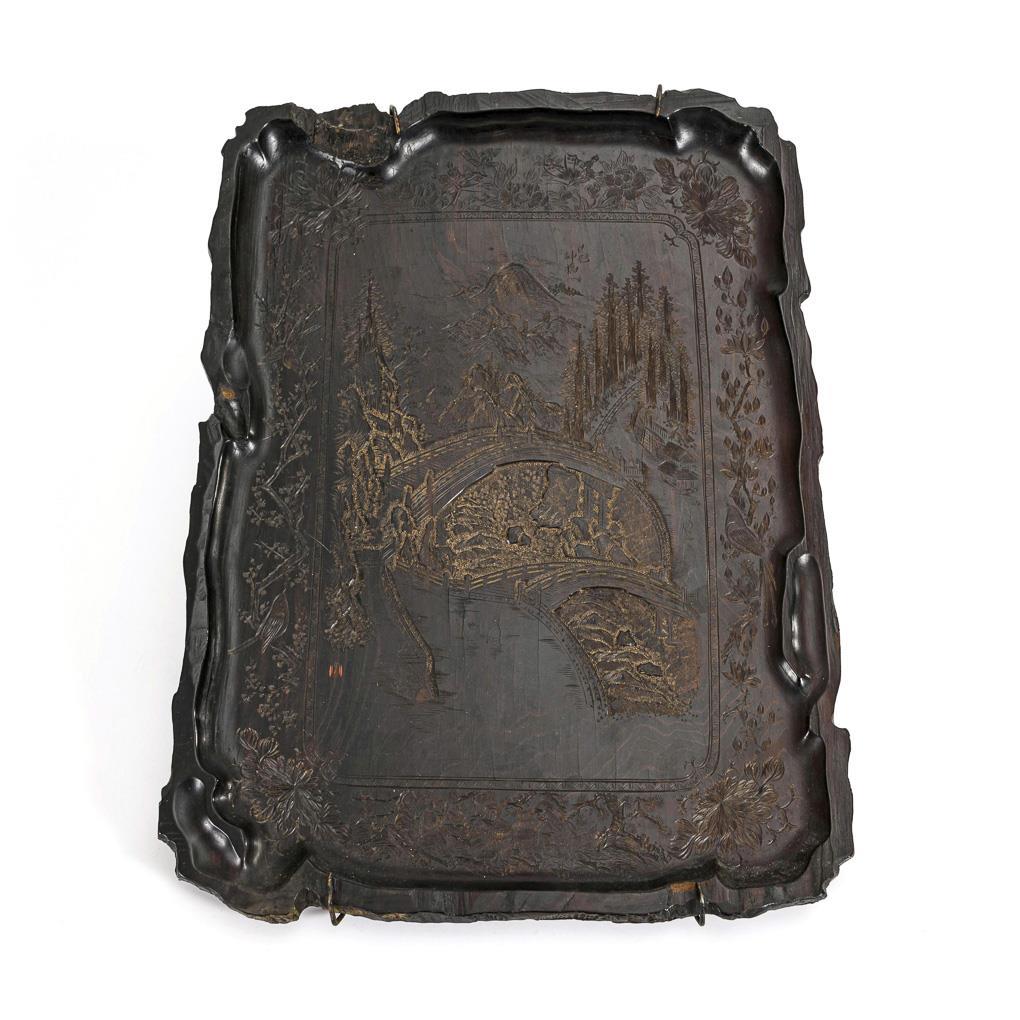 Sehr feine und kunstvolle Darstellung einer Berglandschaft mit Brücken, eingerahmt von einem Flachrelief aus Vögeln und Schmetterlingen auf verschiedenen Pflanzen, sowie den drei weisen Affen (nichts sehen, nichts hören, nichts sagen). Vielschichtige Darstellung, bei der manche Nuancen erst im Streiflicht sichtbar werden. Ein größerer Ausbruch am oberen Rand und kleinere Läsuren.