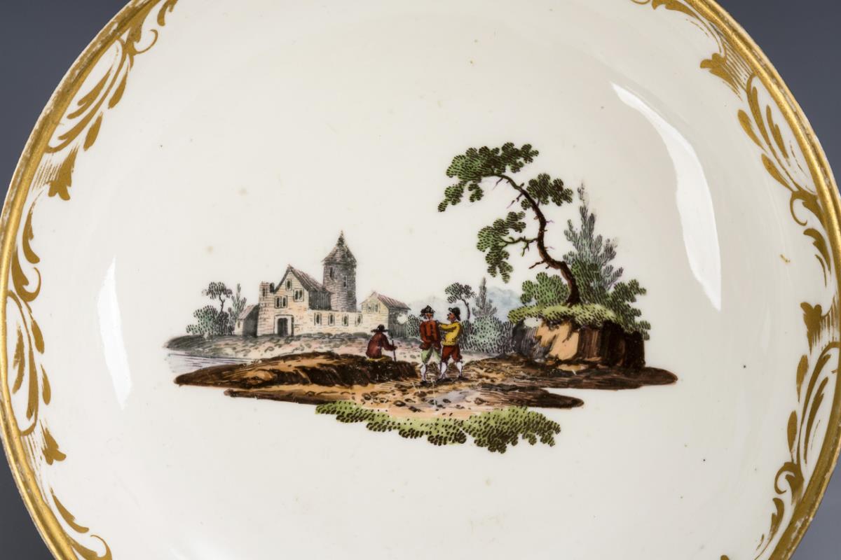Polychrom bemalt, goldstaffiert. Tasse (H 7,5 cm), Untertasse (Ø 13,5 cm).