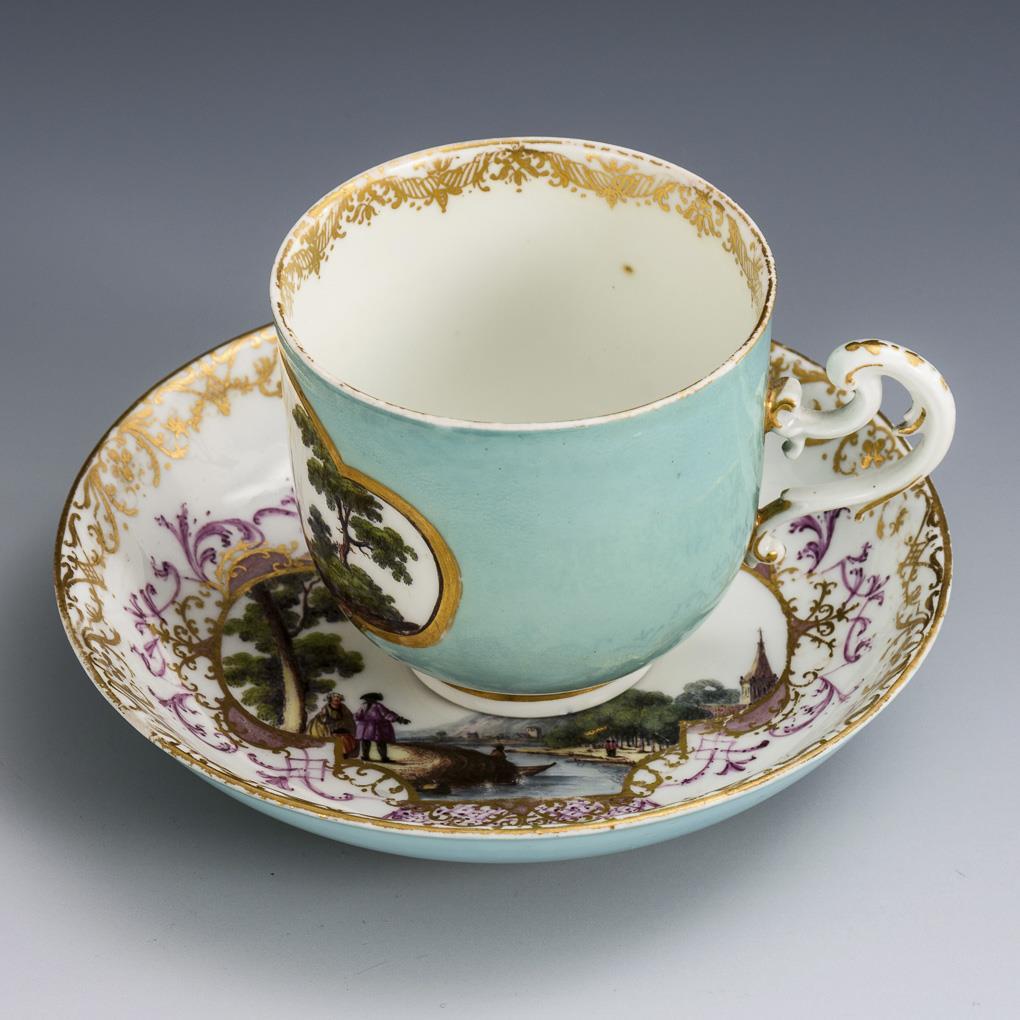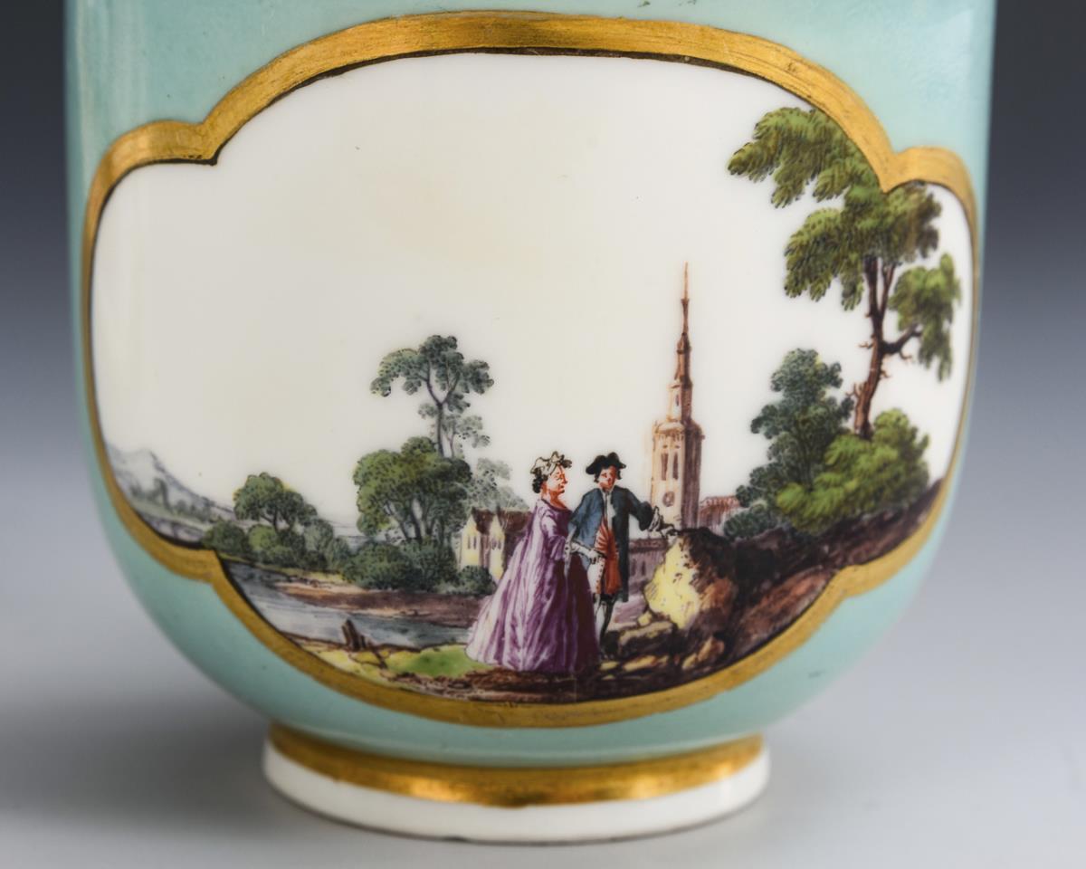 Glockentasse mit Rocaillehenkel. Türkisfarbener Fond, schauseitig eine Vierpasskartusche mit der Darstellung einer Landschaft mit Kirche und Rokokopaar. Minimaler Goldabrieb.