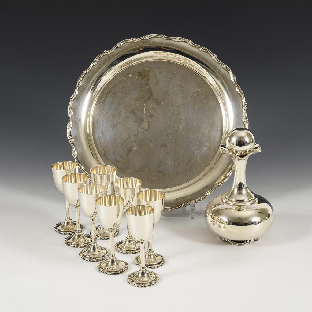 Glatte Form mit Reliefkante: Karaffe, 8 Likörkelche und rundes Tablett. Gebrauchsspuren, kleine Dellen.