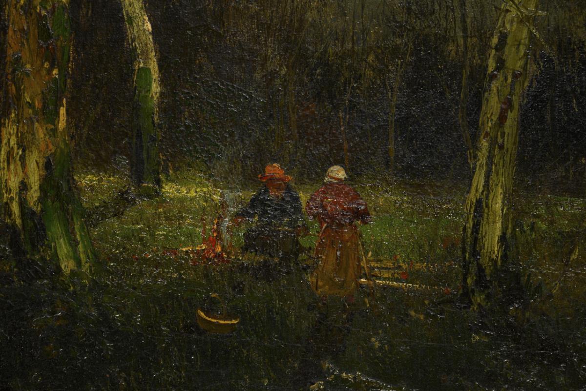 Zwei Personen an einem Lagerfeuer im Schein des Mondes am Waldrand. Altersspuren.