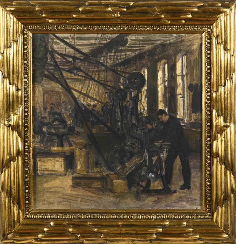 Mehrere Arbeiter an verschiedenen Maschinen bei der Arbeit.