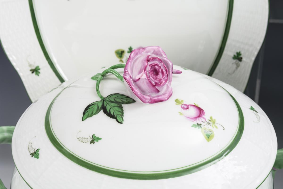 45 Teile. Form "Altozier". Grüner Rand und Rosenmalerei. 12 Speiseteller, 12 Suppenteller, 12 Salatteller, 1 Terrine (H 21 cm), 1 Sauciere, 2 Ovalschalen (L 22 und 26,5 cm), 1 Rundschale (Ø 25,5 cm), 1 Ovalplatte (L 37,5 cm), 2 Gemüseteller (Ø 30 und 33 cm), 1 Dreiecksschale (Ø 24,5 cm). Partiell kleine Farbabplatzer.