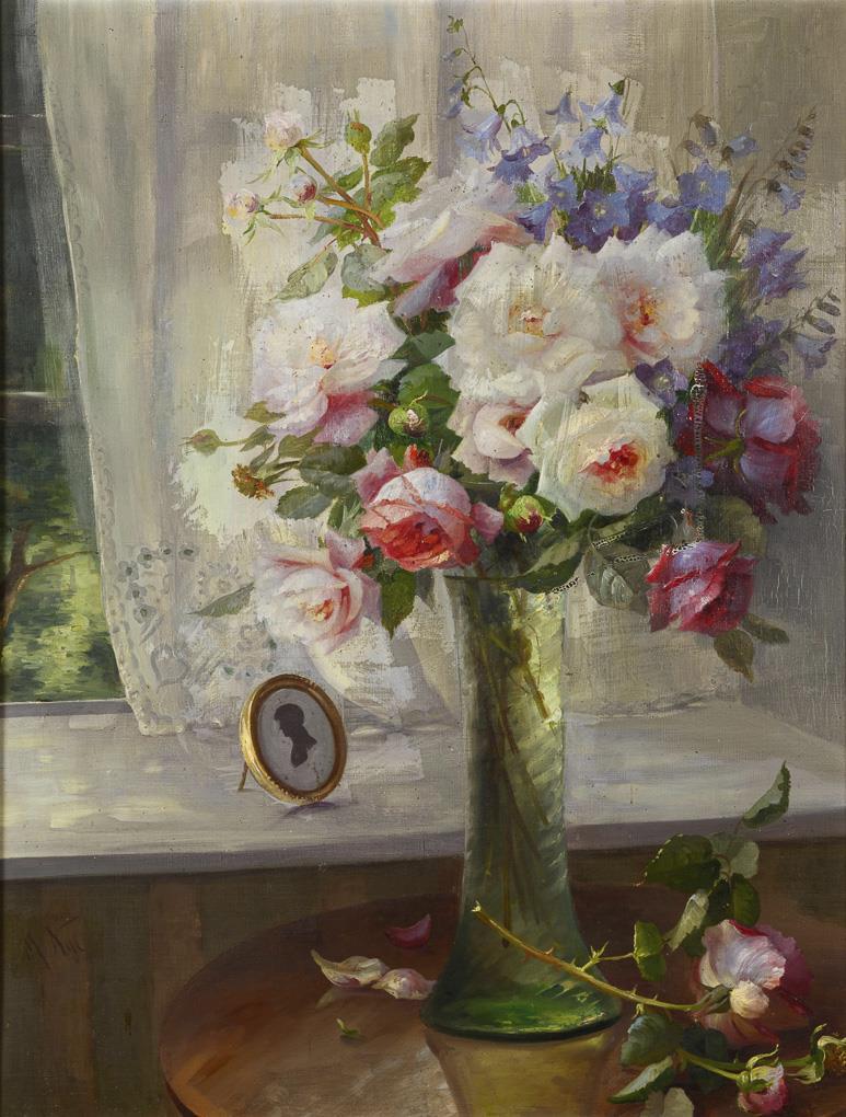 Weiße und rote Rosen neben Glockenblumen in einer hohen Glasvase auf einem runden Tisch neben dem Fenstersims mit einem ovalen Scherenschnitt. Altersspuren.