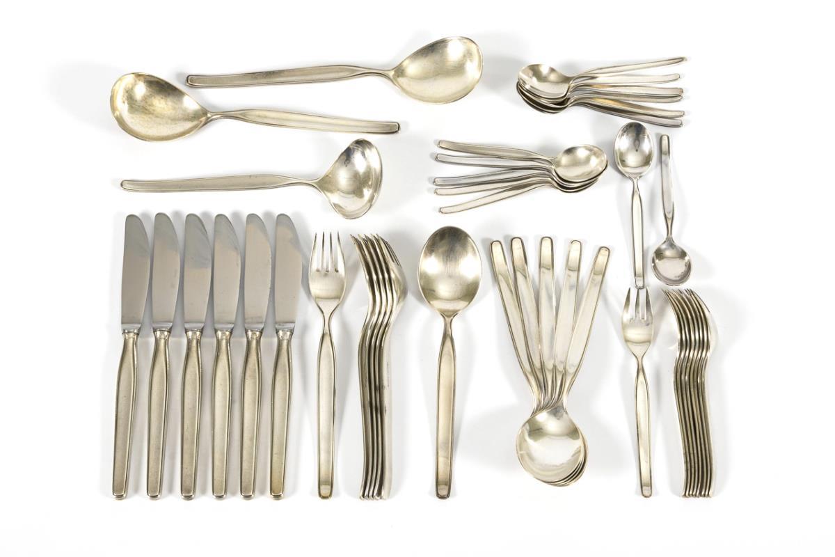 Schlichtes Design im Stil der 1960er Jahre: 6 Speisegabeln, 6 Messer, 6 Kaffeelöffel, 9 Kuchengabeln und 3 Vorlegeteile. Als Zugabe 7 versilberte, passende Kaffeelöffel.