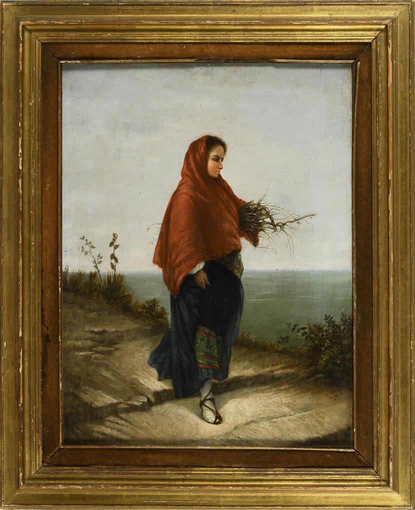 Junge Frau im blauen Rock mit rotem Tuch und einem Bündel Holz auf einem Weg weit oberhalb des Meeres. Leichte Altersspuren.