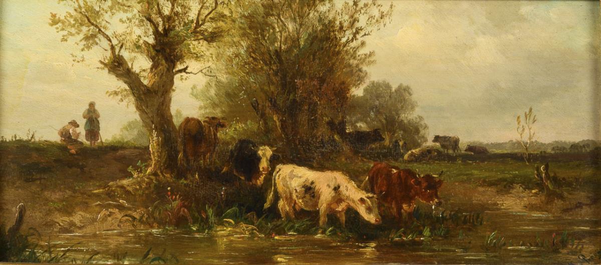 Zwei Landschaften mit Kühen an der Wasserstelle