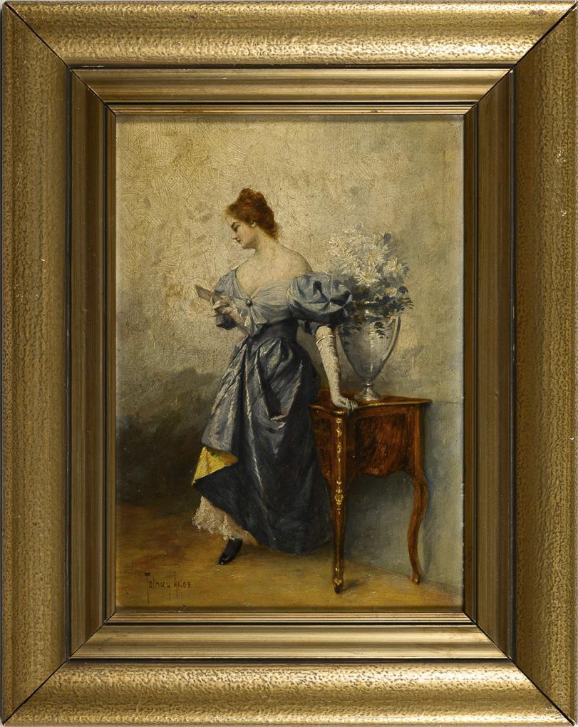 Junge Frau in festlichem Kleid mit einem Brief an einer Kommode.