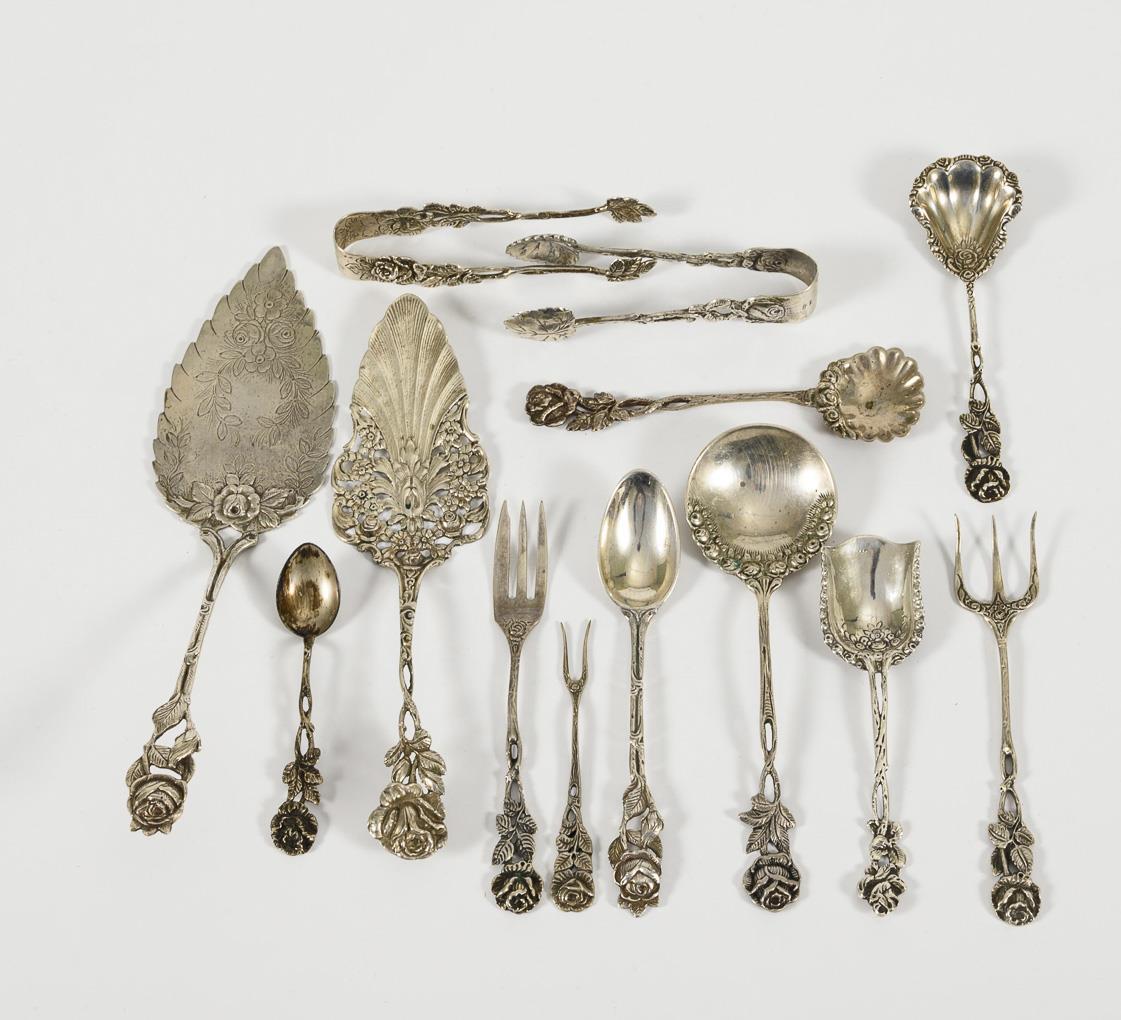 40 Teile mit Reliefdekor Hildesheimer Rose: 2 Tortenheber, 2 Zuckerzangen, 3 Zuckerlöffel, 1 Sahnelöffel, 6 + 6 Kuchengabeln jeweils in Etui, 6 Kaffeelöffel, 11 + 1 kleine Vorlegegäbelchen und als Zugabe 2 kleine versilberte Löffelchen.